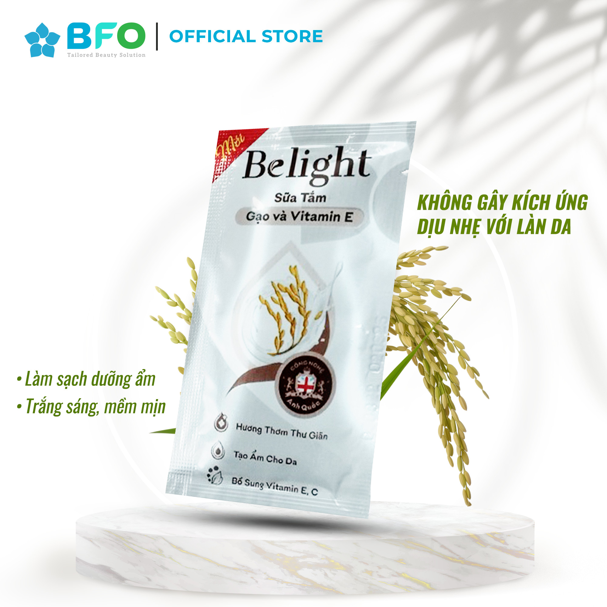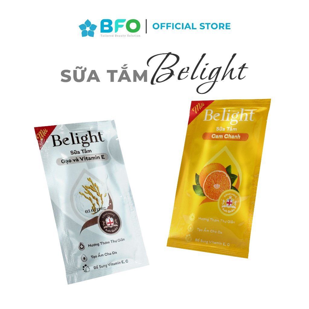 Belight Sữa Gạo và Vitamin E: Chiết xuất từ Gạo và dẫn xuất Vitamin E giúp làm sạch da, dưỡng ẩm, bật tone trắng sáng, mềm mịn.