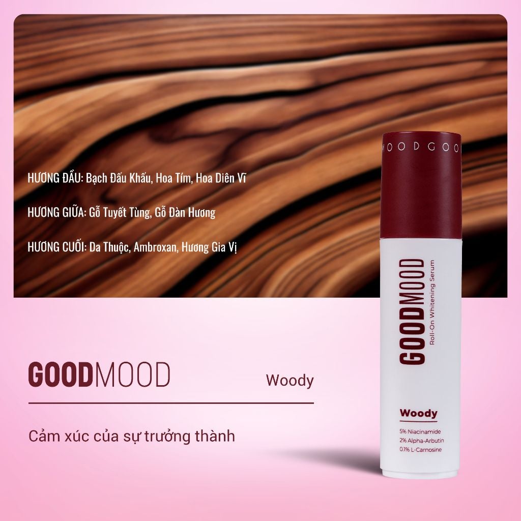 Goodmood Woody: Hương bạch đậu khấu, hoa tím và diên vĩ nhẹ nhàng, kết hợp gỗ tuyết tùng và đàn hương giúp khử mùi hiệu quả. Lớp hương da thuộc và ambroxan tinh tế, phù hợp môi trường công sở, lịch thiệp.