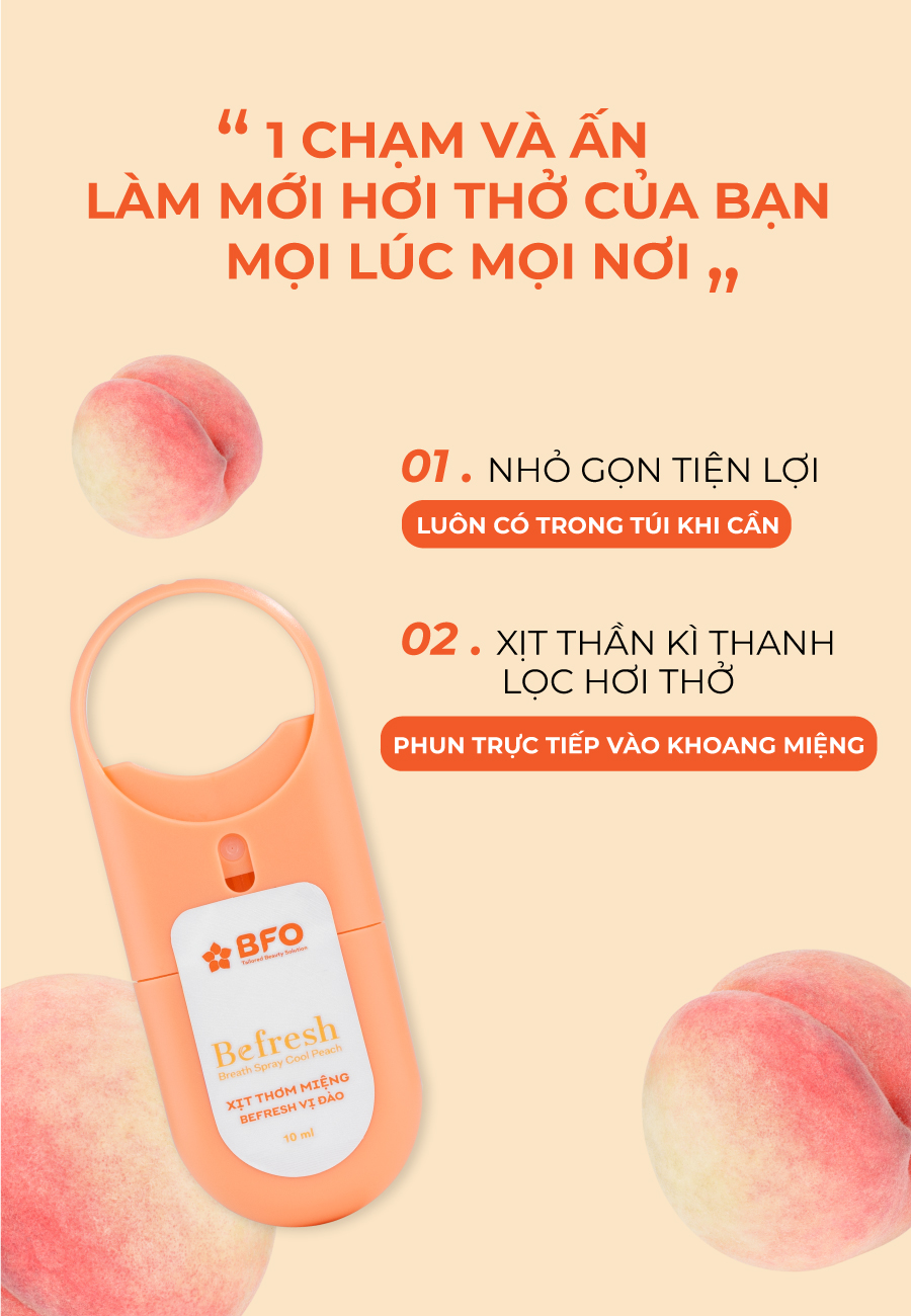 Xịt Thơm Miệng Khử Mùi Hôi Miệng Hương Trái Cây Tự Nhiên BFO Befresh 10ml nguyên liệu đến từ thiên nhiên cho hơi thở thơm mát, diệt khuẩn, khử hôi trong vòng 3 giây, giúp hơi thở sảng khoái